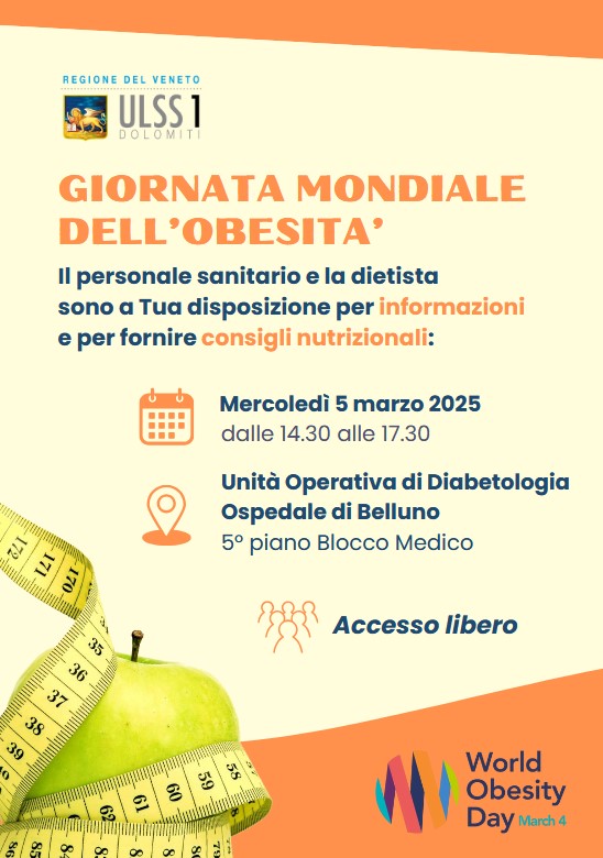 Il 4 marzo ricorre la Giornata mondiale dell’obesità. Per sensibilizzare i cittadini sul tema mercoledì 5 marzo 2025 dalle 14.30 alle 17.30 nel reparto di Diabetologia dell’ospedale di Belluno (quinto piano, blocco medico) il personale sanitario e la dietista saranno a disposizione, con accesso libero, per informazioni e consigli per uno stile di vita sano, attraverso la misurazione della pressione arteriosa, della circonferenza vita e della valutazione dello stato nutrizionale dell’organismo.