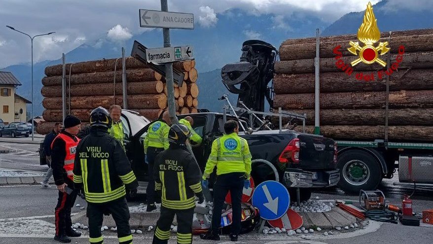 Incidente a Calalzo tra un pick-up e un camion carico di tronchi: due feriti, uno di codice rosso