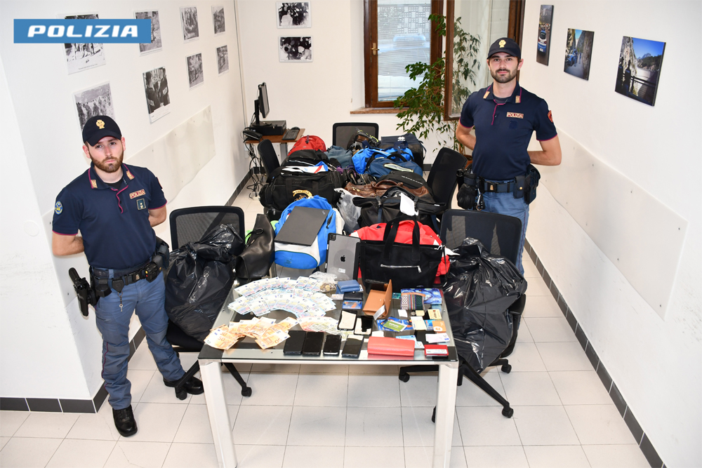 I due uomini sono stati trovati a Santa Giustina, erano intenti a disfarsi della merce di cui non avevano interesse gettandola nei campi. I poliziotti sono riusciti a recuperare tutta la refurtiva, di ingente quantità e valore: denaro contante, computer, tablet, orologi, telefoni, borse, occhiali da sole, zaini.