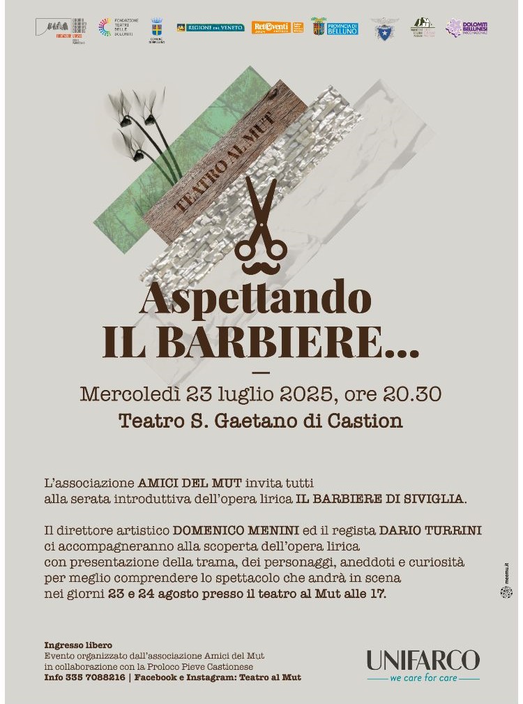 L’iniziativa, dal titolo «Aspettando Il barbiere…», è pensata come introduzione allo spettacolo che andrà in scena il 23 e 24 agosto al Teatro al Mut. Nel corso dell’incontro, il direttore artistico Domenico Menini e il regista Dario Turrini accompagneranno il pubblico alla scoperta della celebre opera di Gioachino Rossini, offrendo una presentazione della trama, dei personaggi principali e condividendo aneddoti e curiosità utili a una lettura più consapevole della rappresentazione.