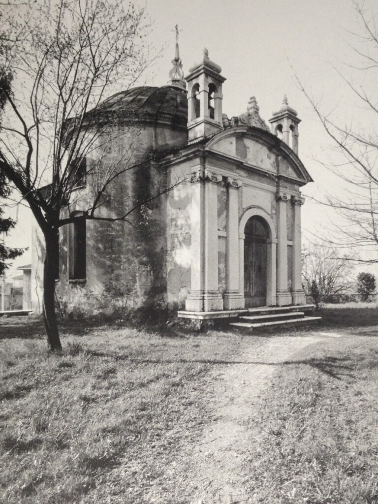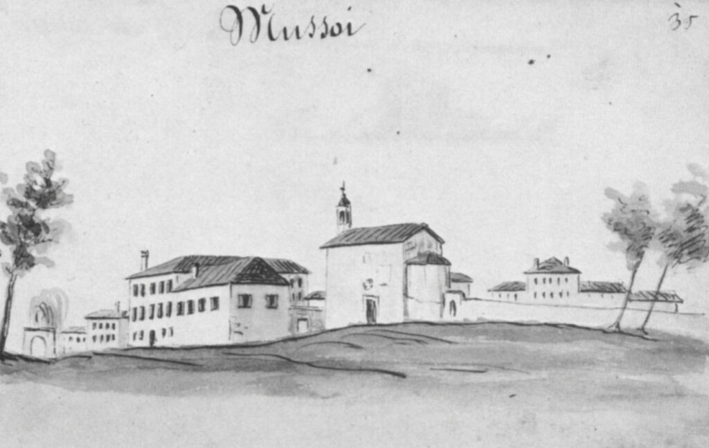 - La piccola settecentesca Villa Pagani era ancora visibile negli anni Sessanta. Negli anni successivi è stata via via inglobata nei palazzi di cemento tanto che oggi nessuno più s’immagina che esista. Nel disegno ottocentesco del Monti la si nota, dietro il muro, a destra. Sulla sinistra della chiesetta si vede la casa natale di Papa Gregorio XVI e in fondo alla via si nota un arco (presente anche in un altro disegno sul medesimo sito). ↩︎