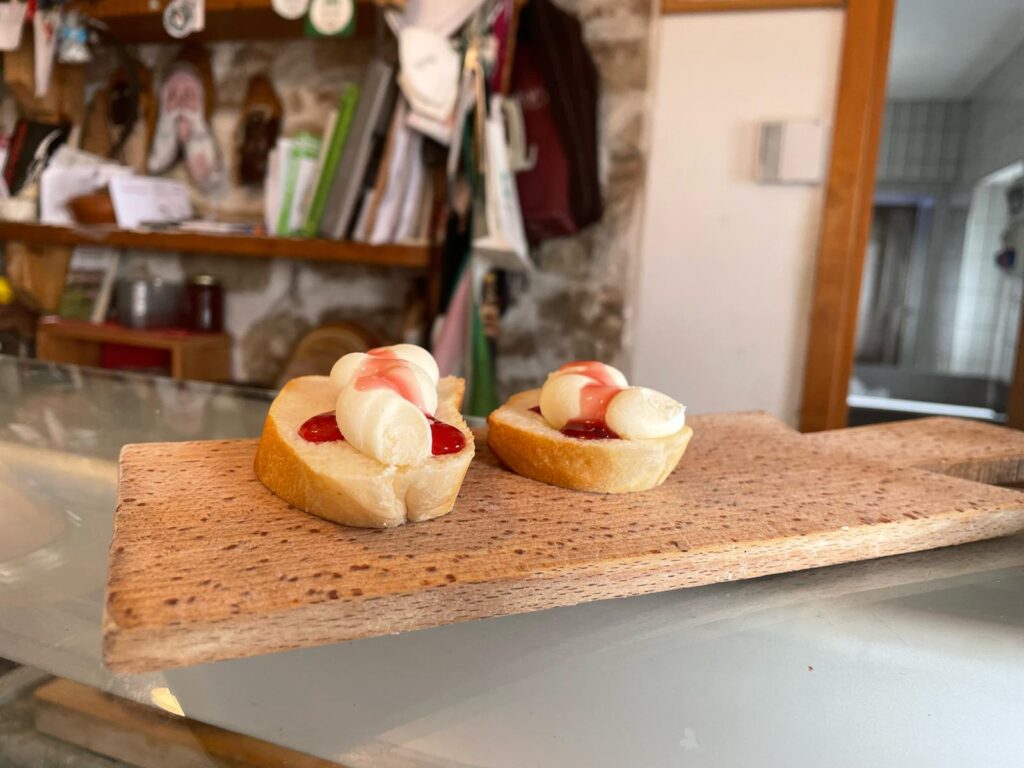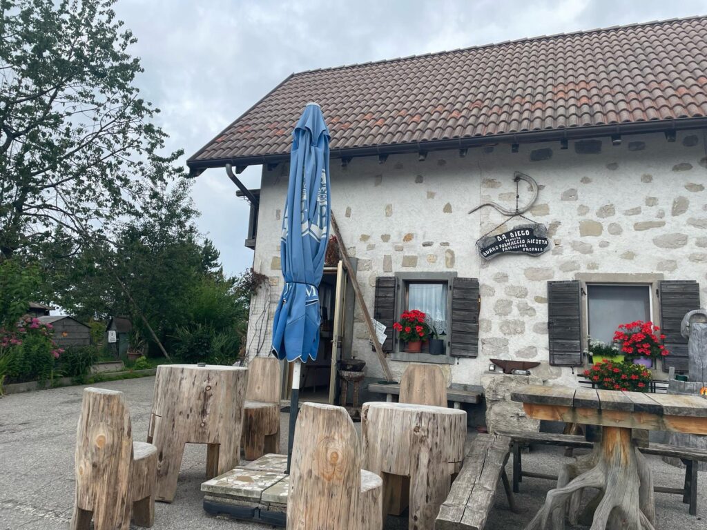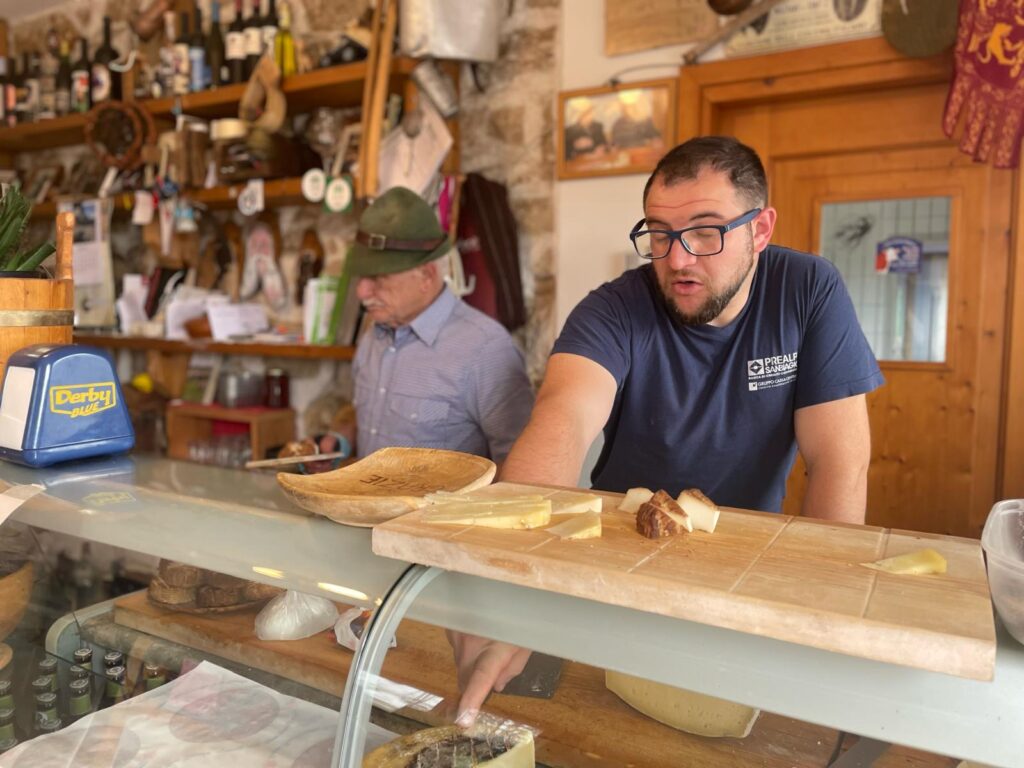 Oggi Diego ha 82 anni e la sua bottega dà proprio quella sensazione di altri tempi: non più di 20 metri quadrati all’interno di una malga di sasso, in cui colleziona cimeli e vende ancora i formaggi, accompagnati da un’ombra di vino rosso o bianco, e molte chiacchiere sulla sua storia e quella della sua famiglia. All’esterno due tavoli, ricavati da un grande tronco d’albero, per chi vuole sedersi, ammirando la vallata e assaggiando un tagliere, oppure, se si arriva all’ora giusta, una ricotta appena affiorata dal siero, ancora calda. Un posto noto, ma non affollato, dove anche le signore del luogo fanno capolino per chiedere a Diego se ha delle uova: le sue galline, un po’ capricciose, non sempre producono, ma quando lo fanno vale la pena.