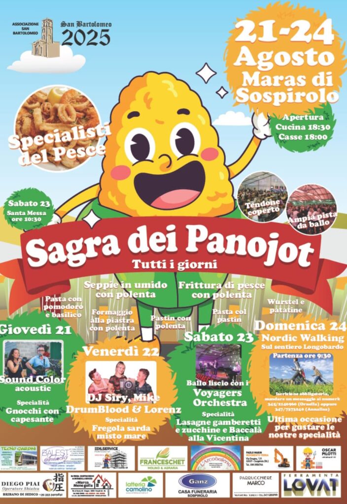 Dal 21 al 24 agosto 2025 la frazione di Maras, in comune di Sospirolo, si mobilita per la Sagra dei Panojot, appuntamento che unisce cucina tipica, musica e attività all’aperto. L’apertura è fissata ogni sera alle 18.30. La sagra si svolge sotto un tendone coperto, con un’ampia pista da ballo.