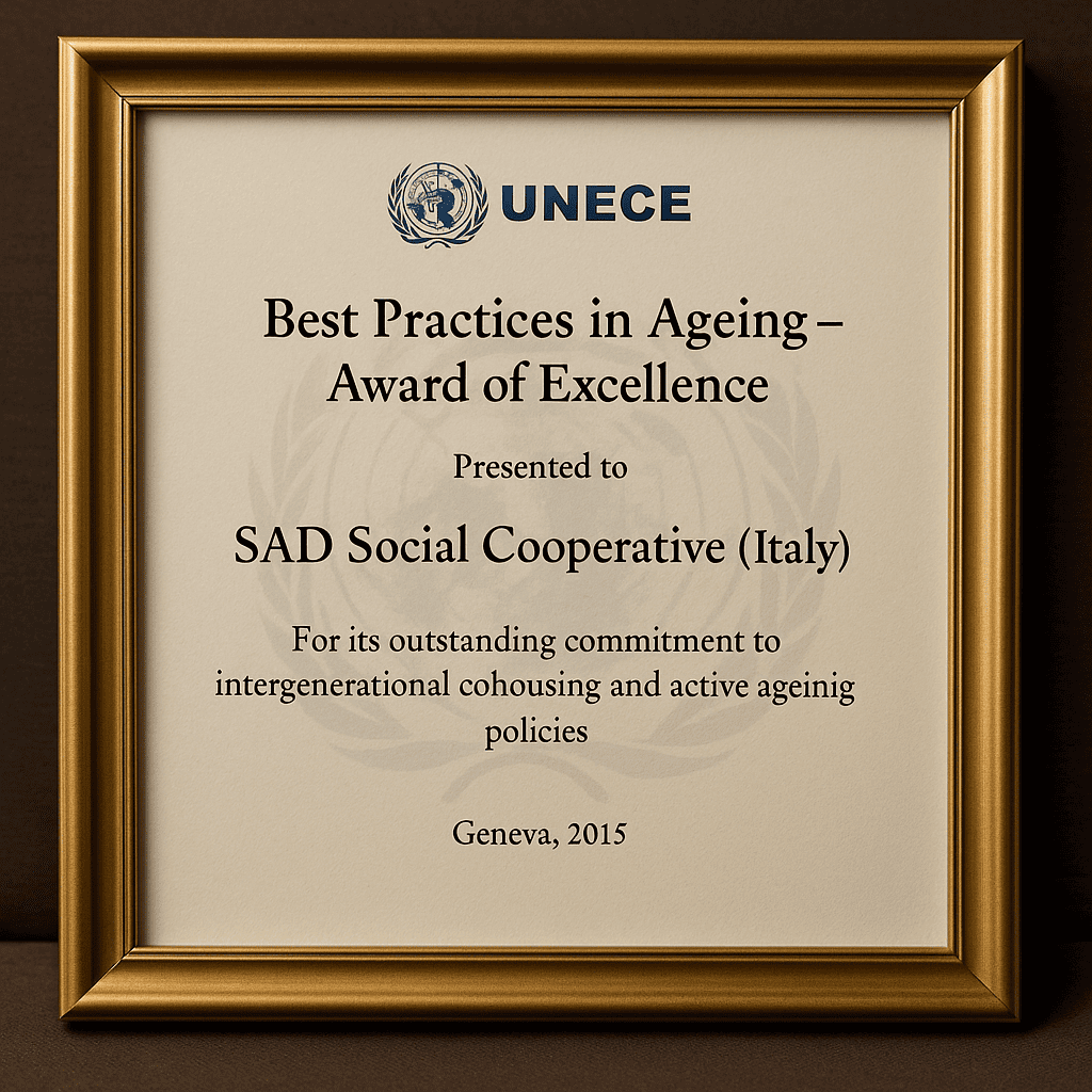 Il riconoscimento dell’UNECE – Commissione Economica delle Nazioni Unite per l’Europa – ha avuto un grande valore per noi. Siamo stati inseriti tra le “Best Practices in Ageing”, selezionate a livello europeo per la loro capacità di proporre modelli innovativi nel campo della longevità attiva e dell’abitare sociale. Nel report ufficiale si legge: