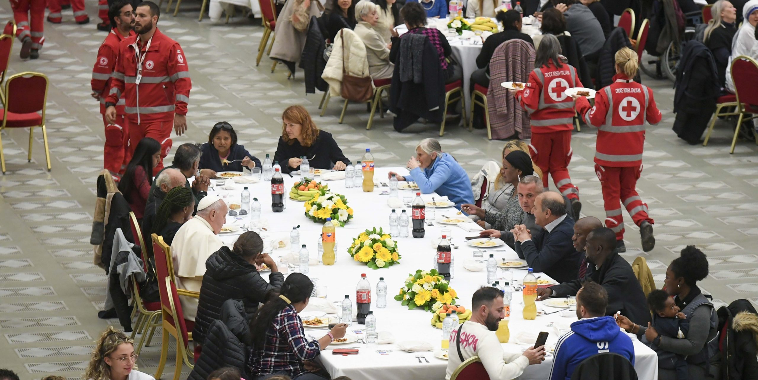 «Quando offri un banchetto, invita poveri, storpi, zoppi, ciechi; e sarai beato perché non hanno da ricambiarti» (Lc 14,1ss). (nella foto SIR Vatican Media: 17 novembre 2024, Papa Francesco a pranzo con gli ultimi per l'VIII Giornata mondiale dei poveri)