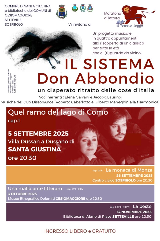 Il progetto, intitolato «Il sistema – Don Abbondio, un disperato ritratto delle cose d’Italia», prevede quattro serate in cui le pagine manzoniane verranno lette e accompagnate dalle fisarmoniche del Duo DissonnAnce, formato da Roberto Caberlotto e Gilberto Meneghin. Le voci narranti saranno quelle di Elena Galvani e Jacopo Laurino.