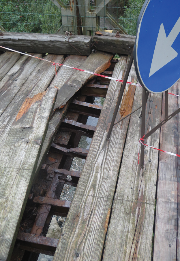 La struttura del ponte Bailey è profondamente danneggiata dal tempo e dalle intemperie, l’anima di ferro del manufatto è profondamente corrosa e a tratti spezzata.GOSALDO – Olivo Masoch, tenace residente stabile nella frazione di Ronch, con la moglie Marilisa Marcon. La sua disabilità permanente lo obbliga a utilizzare due autovetture per ogni necessità, anche sanitaria: una per portarsi fino al ponte, l’altra – al di là del torrente Mis – per uscire dalla valle. E con il suo automezzo riesce comunque ad aiutare i residenti temporanei che devono raggiungere Pattine, di fronte alle rovine di California.GOSALDO – California nel 1965. Un anno dopo l’alluvione si portò via tutto. Sono rimasti solo alcuni villaggi con un pugno di persone: isolati dal 24 giugno.