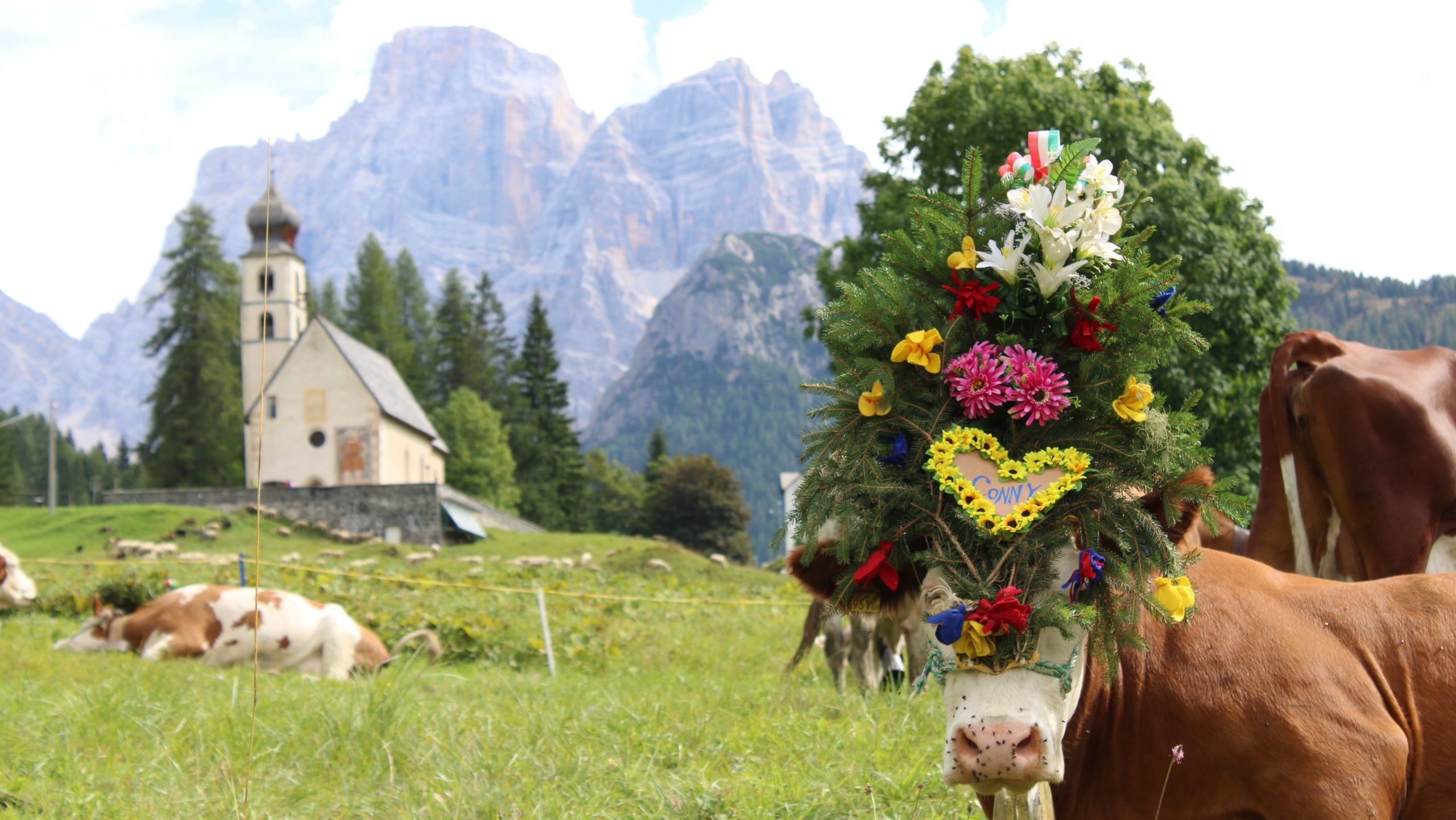 La banda ad aprire la processione e poi bambini in abiti tradizionali, mucche, cavalli, capre e pecore, addobbati a festa, con i loro padroni, ma anche auto storiche e mezzi dei Vigili del Fuoco, della Croce Bianca e del Soccorso Alpino