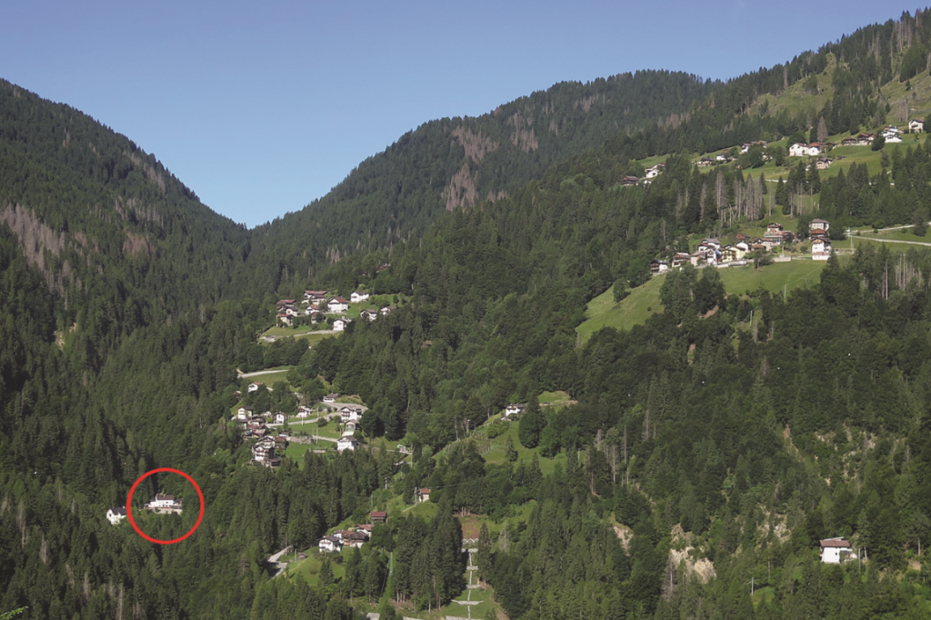 La localizzazione (nel cerchio rosso) del “Bar – Alimentari S. Tomaso” a Medavàl (Mezzavalle), giù nel profondo della valle dell’oscuro Ru de le Calchère, dove il sole non arriva per ben quattro mesi; ma il calore umano c’è sempre. Sul versante del Piz Zorlét si dipana irregolare la colonizzazione del territorio con le varie frazioni sparse, sorte negli spazi meno erti del pendìo. Sullo sfondo Forcella San Tomaso, andito per la Valle del Biois.