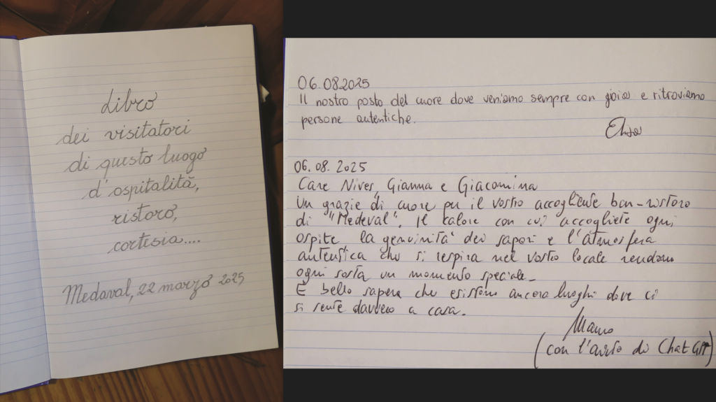 Antiporta del Libro dei Visitatori, a disposizione dal 22 marzo 2025, e i messaggi lasciati da due clienti il 6 agosto: «Il nostro posto del cuore»; «l’atmosfera autentica che si respira».