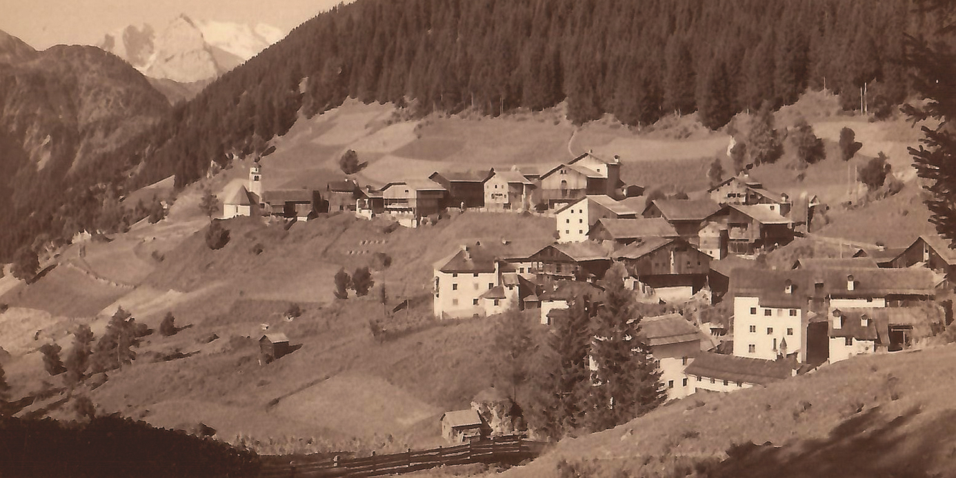 Di Giorgio Fontanive. Andràz (Andràc in Fodóm) qui negli anni ’80 dell’Ottocento, prima della costruzione della Dolomitenstrasse.