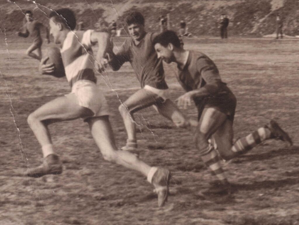 Alla fine del ’58, credo, arrivò la novità del rugby 13[1], che si giocava con un pallone diverso da quello da calcio e molto più difficile da afferrare: uno sport da fare con mani e piedi ma soprattutto, con la testa!