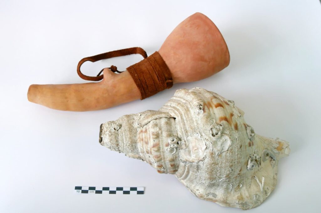 «Ci sono alcuni esemplari di flauti in osso, un materiale che si è conservato fino a oggi, ma non è l’unico. È probabile, infatti, che esistessero strumenti anche in legno o in pelle, andati perduti. Alcuni flauti in osso imitano molto bene il verso degli uccelli rapaci, come la poiana; altri, invece, in terracotta e di forma globulare, riproducono alla perfezione il richiamo dell’allocco. Esiste poi anche una sorta di fischietto che imita il verso delle marmotte, tant’è che quando lo si suona esse “rispondono” a distanza. Ma ci sono anche altri strumenti molto affascinanti, come la conchiglia tromba, i cui esemplari meglio conservati risalgono a 18-16 mila anni fa: oltre a produrre un suono simile a quello di una tromba, udibile a chilometri di distanza, questa conchiglia può essere utilizzata anche come tamburello, megafono o per riprodurre il rumore delle onde del mare».