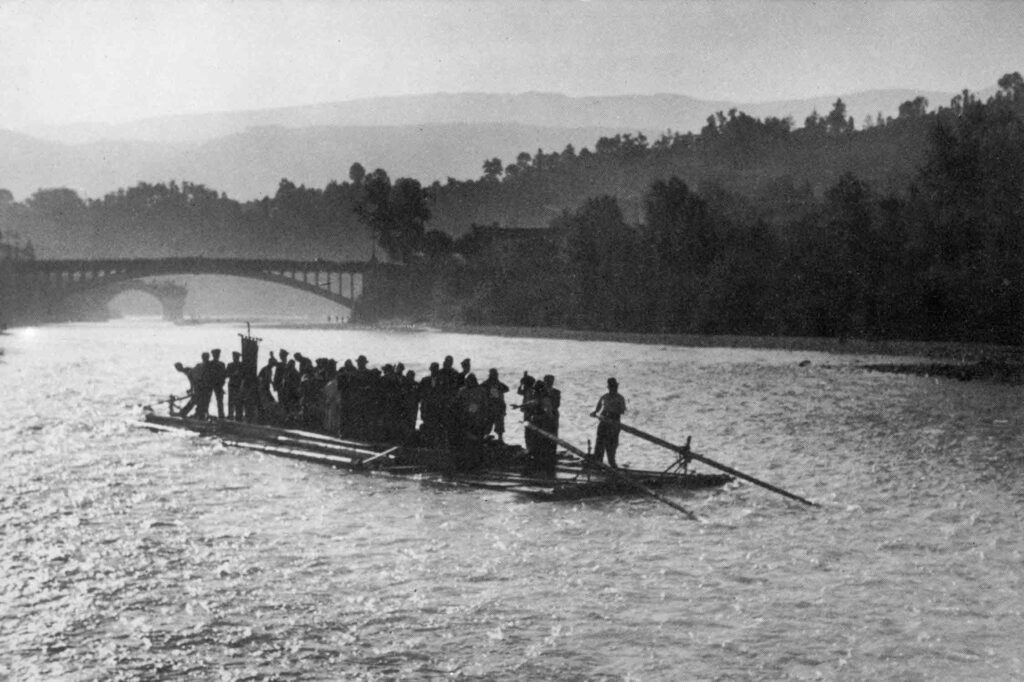 Belluno, 1951. Per breve concessione dell’Enel, il Piave ritorna un fiume e ospita la zattera.