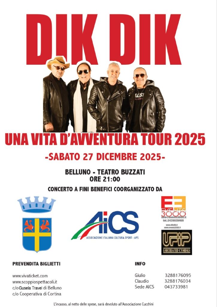 Questo lungo percorso musicale sarà al centro del concerto che i Dik Dik porteranno a Belluno il prossimo sabato 27 dicembre al Teatro Buzzati, nell’ambito del loro «Una vita d’avventura tour 2025». L’evento, a scopo benefico, destinerà il ricavato all’Associazione Cucchini di Belluno. L’iniziativa è co-organizzata dall’Aics provinciale e dal Comune di Belluno – Assessorato alla Cultura.