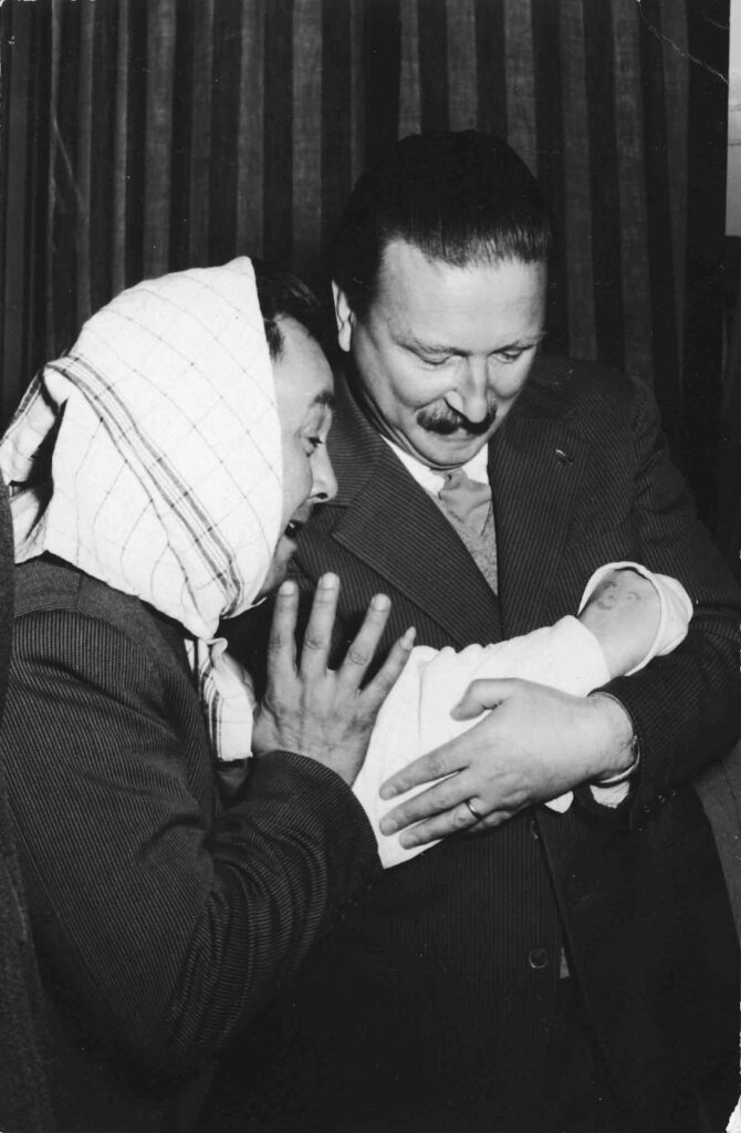 In occasione degli ottant’anni di ‘Sior Domenico, ‘Ginetto’ mi chiese di aiutarlo a realizzare una specie di promozione ‘radiofonica’[3] da trasmettere durante la grande festa che si sarebbe concretizzata all’Hotel Europa[4]; una specie di telegiornale cui seguivano particolari annunci commerciali sui prodotti della Torrefazione e su varie ipotetiche curiose sponsorizzazioni. Io già da tempo, pur se quattordicenne avevo già un bel numero di imitazioni in repertorio. Così ne uscì un notiziario comico modernissimo per i tempi di cui in parte conservo la registrazione[5]. Alla festa intervennero molti amici della Compagnia d’Arte Varia Bellunese, che era spesso ‘sponsorizzata’ dal Cavaliere. Così i nostri ripercorsero a modo loro la storia di Domenico partendo dalla nascita (nella foto si vede mio padre che si rivolge ‘in veste di vecchiotta’ al neonato (il braccio fasciato di ‘ginetto’). Sotto invece, Otello Capovilla recita la poesia dell’Ottantesimo mentre i compari fanno farsa muta.