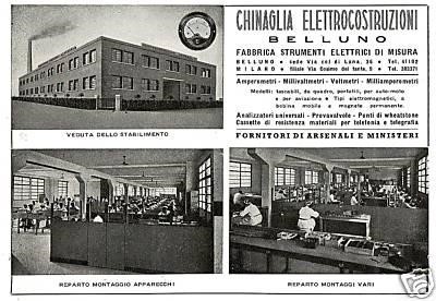 Parallelamente, nello stesso periodo, sempre con scatola in legno ricoperta da finta pelle colore blu, la Chinaglia si cimentava anche nella produzione di un modello di apparecchio fotografico a ‘box’ per pellicola formato 6 x 9, secondo un modello americano allora in voga ispirato alla famosa ‘Kodak camera’. Peraltro, migliorata e perfezionata nel tempo, nonostante il periodo bellico, la produzione degli strumenti di misura elettrici, particolarmente voltmetri, negli anni Cinquanta la Chinaglia lanciò un primo modello di apparecchio fotografico di un certo pregio interamente metallico. La marca coniata era Kristall e l’apparecchio era una buona copia della famosa tedesca Leica con ottiche intercambiabili (passo Leica ovviamente) Steinar, della casa francese Berthiot. e otturatore con velocità di scatto da 1/20 fino a 1 /1000. Nel giro di qualche anno se ne produssero alcune centinaia con varie sigle, la Kristall 2s e la Kristall 3s e, nel 1953, si affiancò il modello Kristall 53. La distribuzione venne affidata alla ditta Guido Nonin di Milano, ecco perché alcuni modelli portano la sigla G.N.M. Una buona campagna pubblicitaria nazionale sulla stampa sembrò offrire una interessante prospettiva di vendita al prodotto, peraltro a Pordenone venne nello stesso periodo costruita una macchina fotografica molto simile la Sonne e, la concorrenza del momento, unita alla mancanza di accordi, fecero in breve cessare entrambe le produzioni. Merita ricordare pure che, nello stesso periodo, sulla scia dello sviluppo del cinema a passo ridotto 8 mm in Italia, la Chinaglia si cimentò, per breve periodo, anche nella costruzione di due modelli di moviole amatoriali (i dati sono stati forniti da Ivano Pocchiesa). Lo stabilimento di via col di Lana, cominciò la sua attività nel 1940 e si specializzò negli anni seguenti, nella produzione di strumenti di misura, come voltmetri, amperometri e ‘tester’ multifunzione, venduti sia in Italia che all’estero. Dopo il rogo, il nuovo stabilimento della Veneggia, entrò in produzione a tempo di record e nel 64 aveva ripreso le forniture. L’azienda fu in seguito associata e poi venduta dalla famiglia Chinaglia alla Carlo Gavazzi spa che la mantenne in loco fino a fine secolo, dopo di che venne ridimensionata e trasferita in piccolo nella zona di Safforze. Il fabbricato fu invece venduto e risulta usato poi da una concessionaria d’auto.