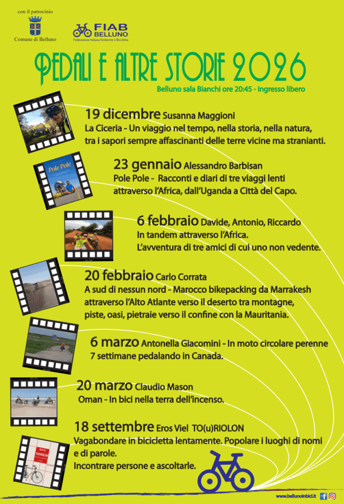 Venerdì 19 dicembre 2025, nella Sala Bianchi di Belluno ha preso avvio la 14ª edizione della rassegna di incontri “Pedali e altre storie”. Il ciclo di serate, patrocinato dal Comune di Belluno, è a ingresso libero e si rivolge a tutta la cittadinanza.