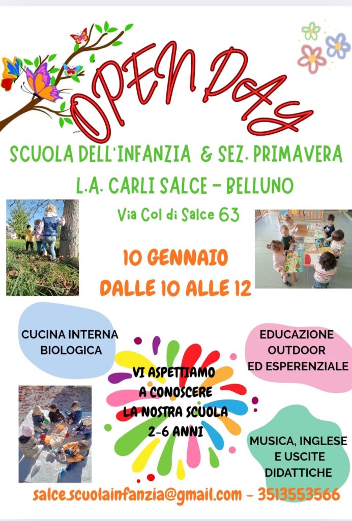 La Scuola dell’Infanzia e la sezione Primavera «Luigi Aldo Carli» a Salce (Belluno) organizzano un Open Day rivolto alle famiglie interessate a conoscere da vicino la proposta educativa dell’istituto. L’appuntamento è fissato per il 10 gennaio 2026, dalle 10 alle 12, nella sede di via Col di Salce 63.