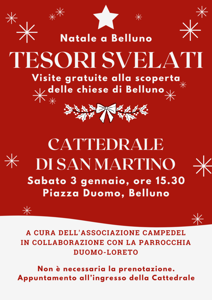Dopo le prime due visite organizzate nel mese di dicembre, l’Associazione Campedel propone un nuovo appuntamento del ciclo dedicato ai tesori d’arte nelle chiese della città Belluno, sotto il titolo «Tesori svelati». L’iniziativa prevede una nuova visita alla Cattedrale di San Martino, pensata per offrire un’occasione di approfondimento sul patrimonio artistico dell’edificio sacro.