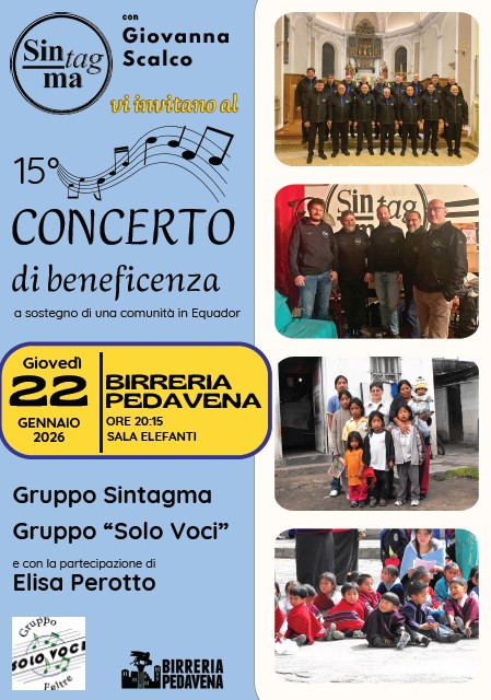 Un appuntamento musicale a scopo solidale è in programma giovedì 22 gennaio 2026 presso la Birreria Pedavena. Nella Sala degli Elefanti, con inizio alle 20.15, si terrà il 15° concerto di beneficenza promosso dal gruppo vocale Sintagma insieme a Giovanna Scalco, a sostegno di una comunità in Ecuador.