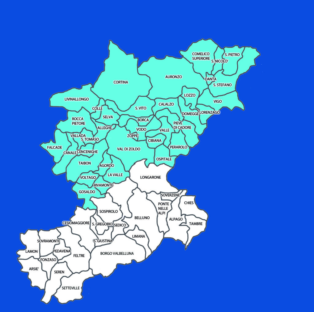 In azzurro i 38 Comuni bellunesi compresi nella perimetrazione dell’area di minoranza linguistica ladina, sulla base della legge nazionale 482 del 1999.