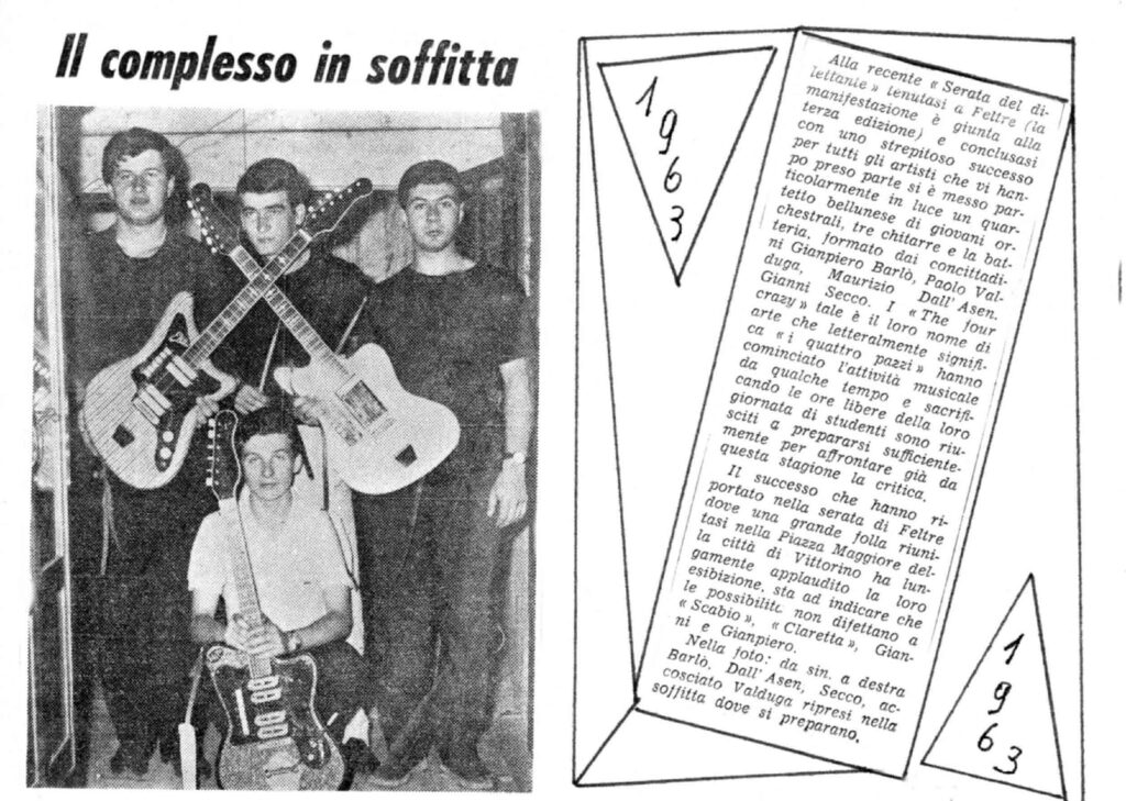 [1] Era il 1963 e vi partecipavano: Paolo Valduga (chitarra), Giampiero Barlò (chitarra e sax), Maurizio ‘Scabio’ Dall’Asen (batteria), Gianluigi Secco (basso).