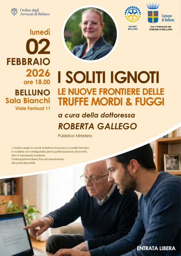 Il Rotary Club Belluno promuove una serata informativa dedicata al tema delle nuove truffe, organizzata in collaborazione con l’Ordine degli Avvocati di Belluno e con il patrocinio del Comune di Belluno. L’incontro, dal titolo “I soliti ignoti. Le nuove frontiere delle truffe mordi e fuggi”, sarà guidato dal pubblico ministero Roberta Gallego.