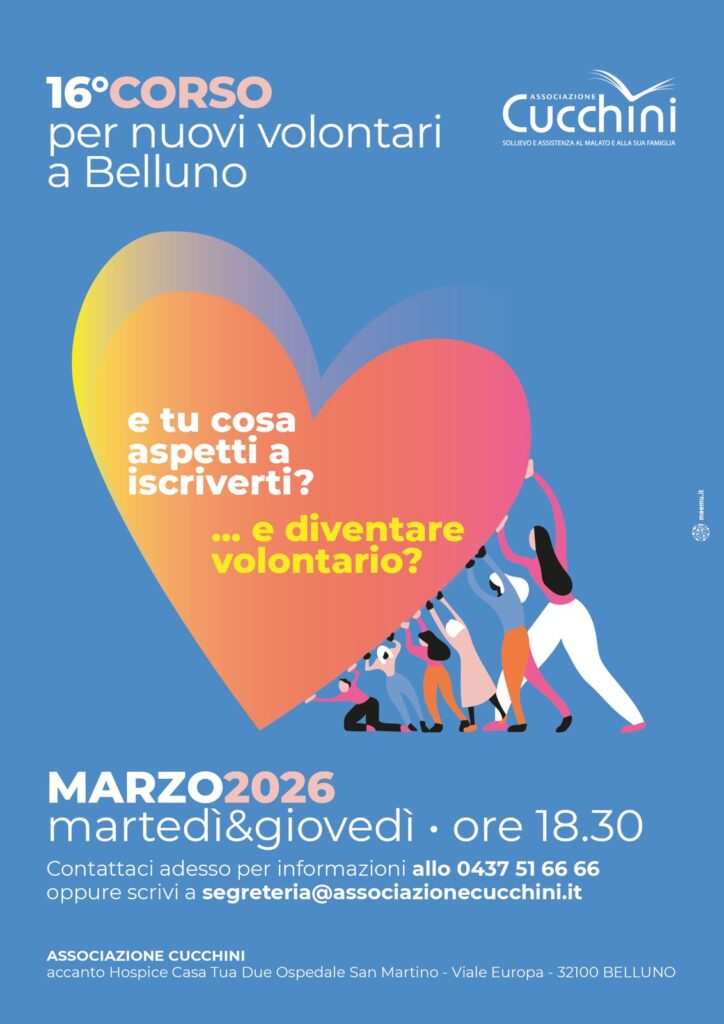 L’associazione Cucchini si prepara ad avviare, il prossimo marzo, la sedicesima edizione del corso di formazione per nuovi volontari, organizzato nella sede accanto all’hospice Casa Tua 2. L’iniziativa rinnova un impegno che prosegue da decenni nel territorio bellunese.