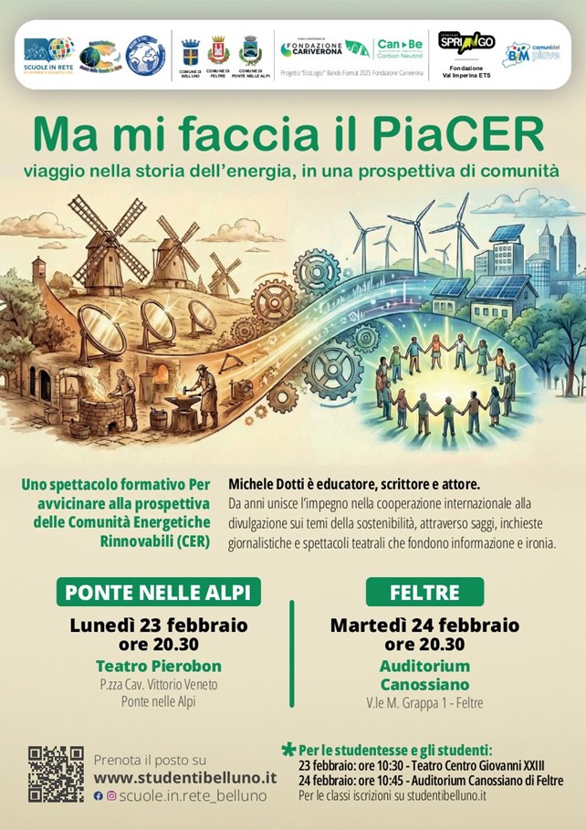 Gli appuntamenti, riuniti sotto il titolo «Ma mi faccia il PiaCer: viaggio nella storia dell’energia, in una prospettiva di comunità», propongono un percorso che attraversa la storia delle fonti energetiche e delle tecnologie, fino ad arrivare al tema delle Cer. Il programma prevede due incontri mattutini rivolti agli studenti: il 23 febbraio al Centro Giovanni XXIII di Belluno e il 24 febbraio all’Auditorium Canossiano di Feltre. Nelle stesse giornate sono previsti anche due appuntamenti serali aperti alla cittadinanza, alle 20.30: il 23 febbraio al Teatro Pierobon di Ponte nelle Alpi e il 24 febbraio nuovamente all’Auditorium di Feltre.