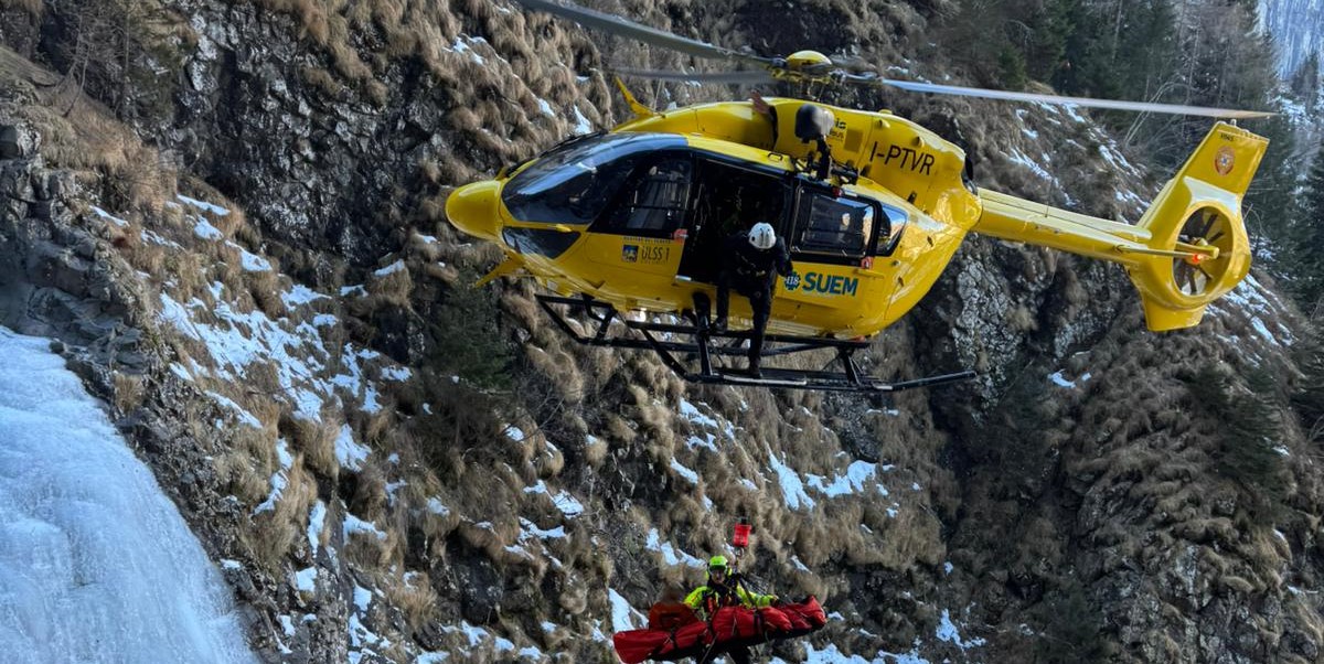 Due interventi di elisoccorso nel Bellunese: un alpinista cade su una cascata di ghiaccio in Val di Gares, uno scialpinista si ferisce in Alpago. Entrambi recuperati e soccorsi.