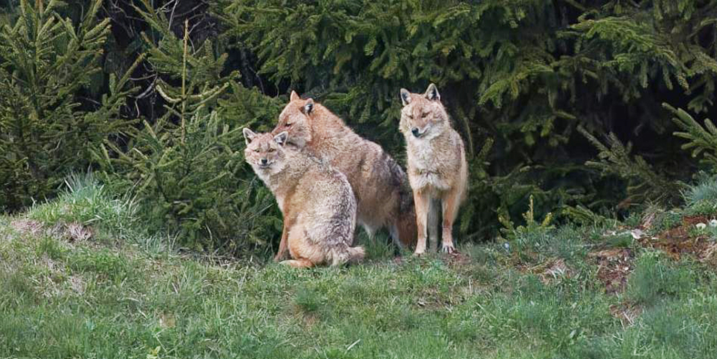Una famiglia di sciacalli dorati: madre gravida, padre e femmina che aiuterà nell'allevamento dei cuccioli. (De Zolt)