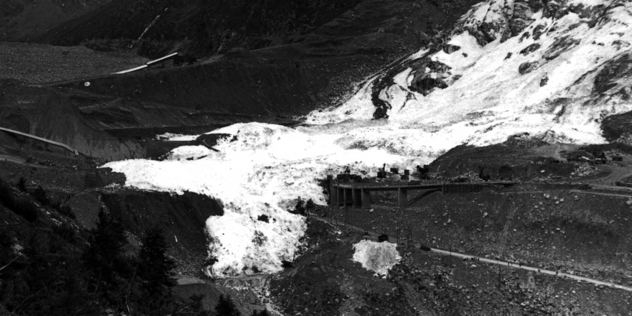Il 30 agosto 1965 valanga di ghiaccio e detriti uccise 88 operai, molti provenienti dalla provincia di Belluno. Nella foto uno scatto della tragedia di Mattmark.